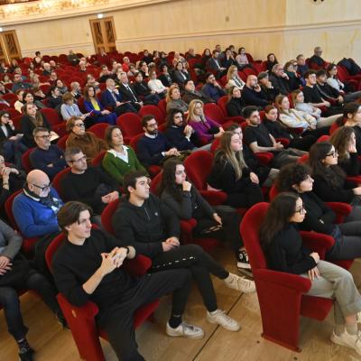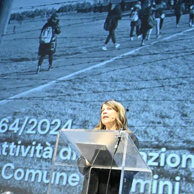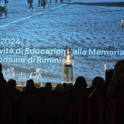 La seconda parte dell'incontro è stata introdotta dall'assessora Francesca Mattei che, dopo la condivisione di alcune video interviste dei partecipanti ai primi viaggi memoria del Comune di Rimini, ha introdotto le studentesse e gli studenti, che hanno partecipato al viaggio ad Auschwitz Birkenau lo scorso ottobre, insieme al Sindaco Jamil Sadegholvaad.
